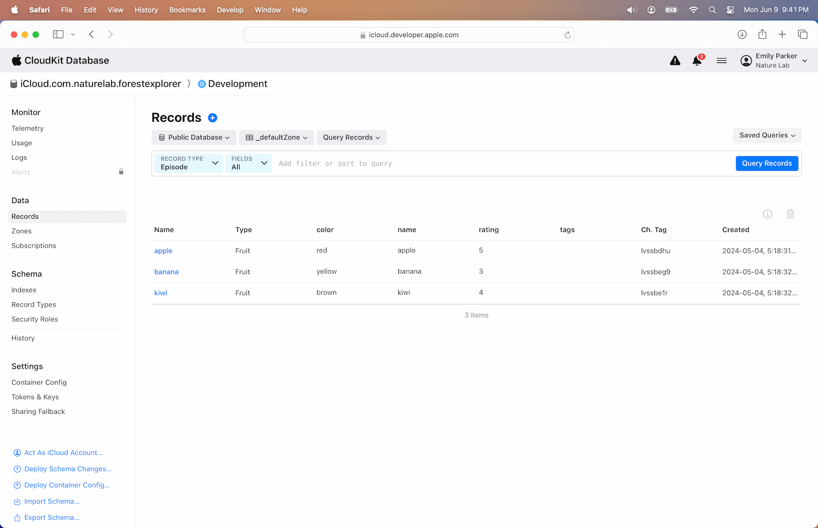 CloudKit Console 是一个直观的网页控制面板,可供你在 App 的整个开发生命周期内使用。从开发到生产的每个阶段,你都可以查看 App 的服务器活动、管理容器、维护数据库方案,以及查看和编辑测试数据。