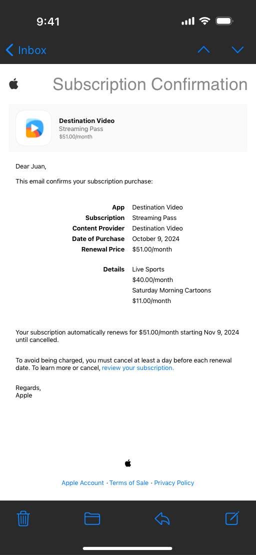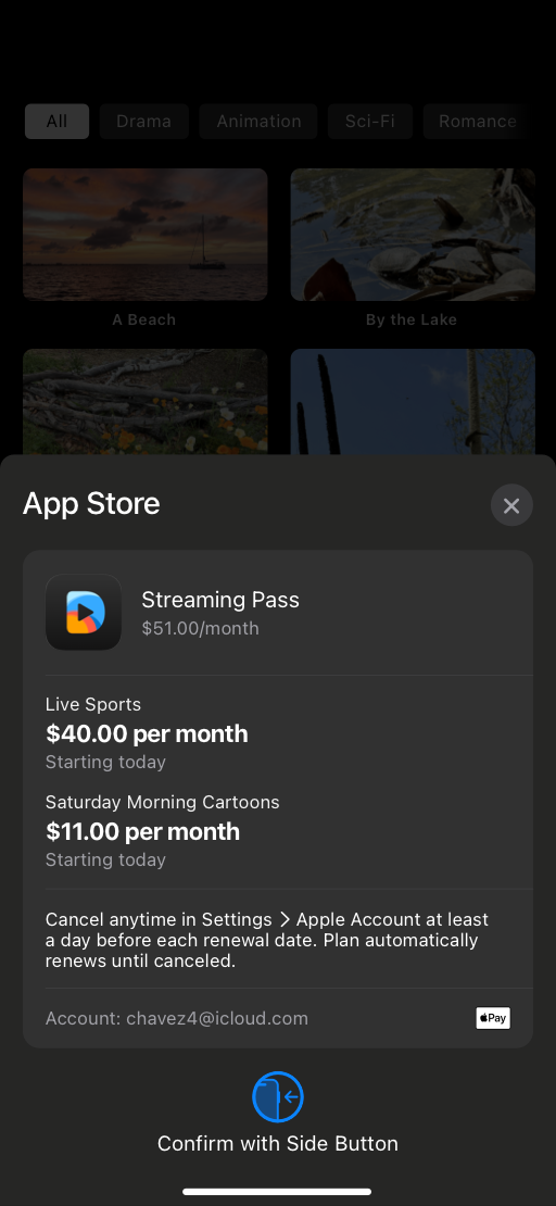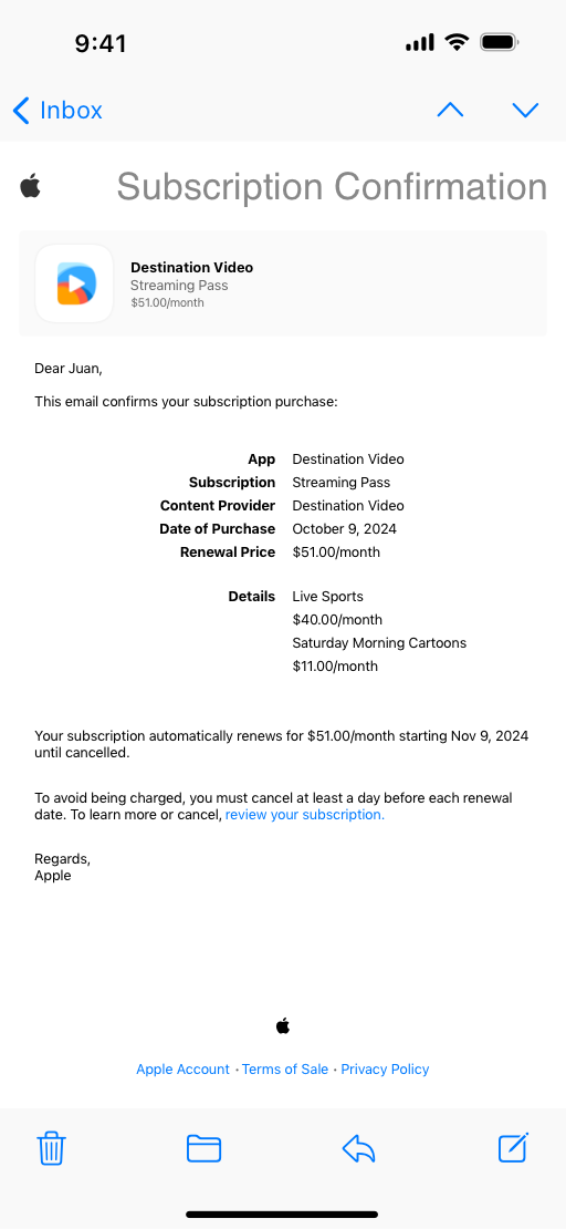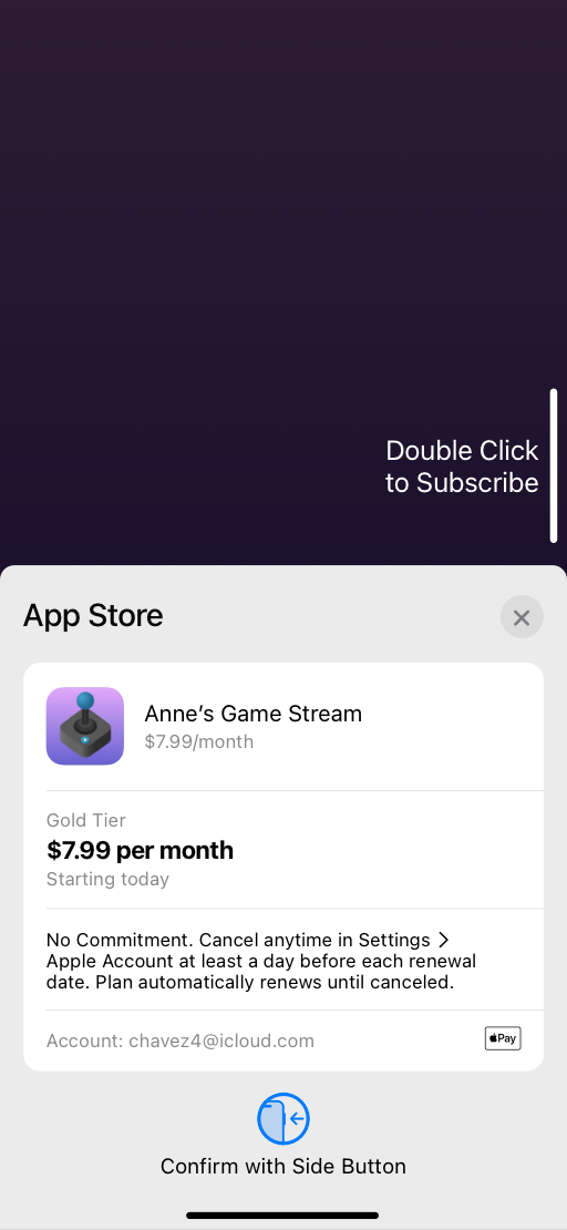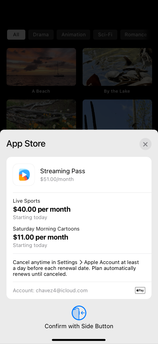 作为核心服务的一部分,在同一 App 内,用户可通过一次性购买获得含有可选订阅附加内容的订阅:用户可以订阅特定服务以及其他订阅附加内容或服务,所有这些都在同一 App 内作为单个订阅自动续订。例如,一款娱乐 App 提供基础订阅服务,同时还有付费频道、体育赛事或地区特色内容等其他订阅附加内容。