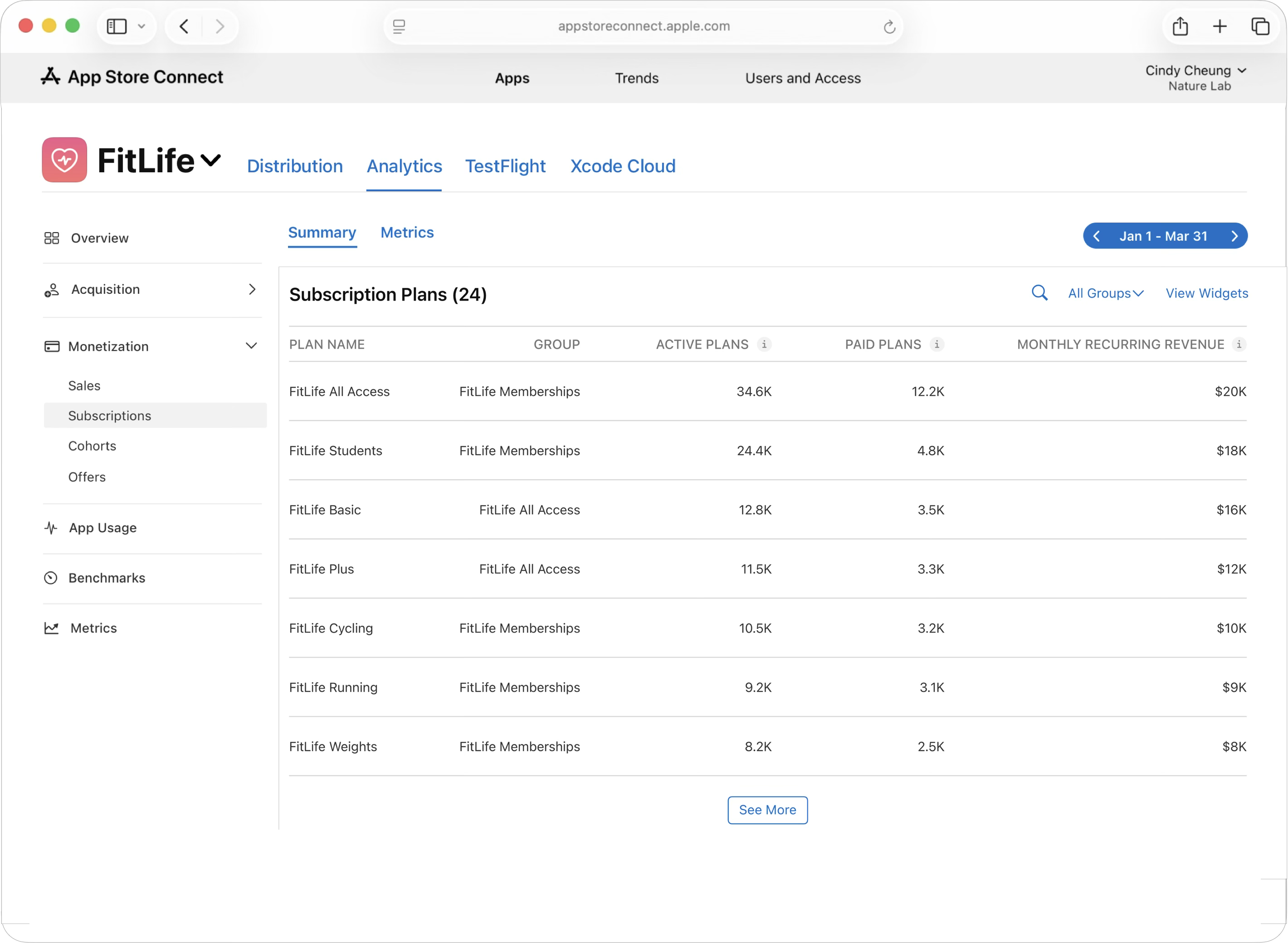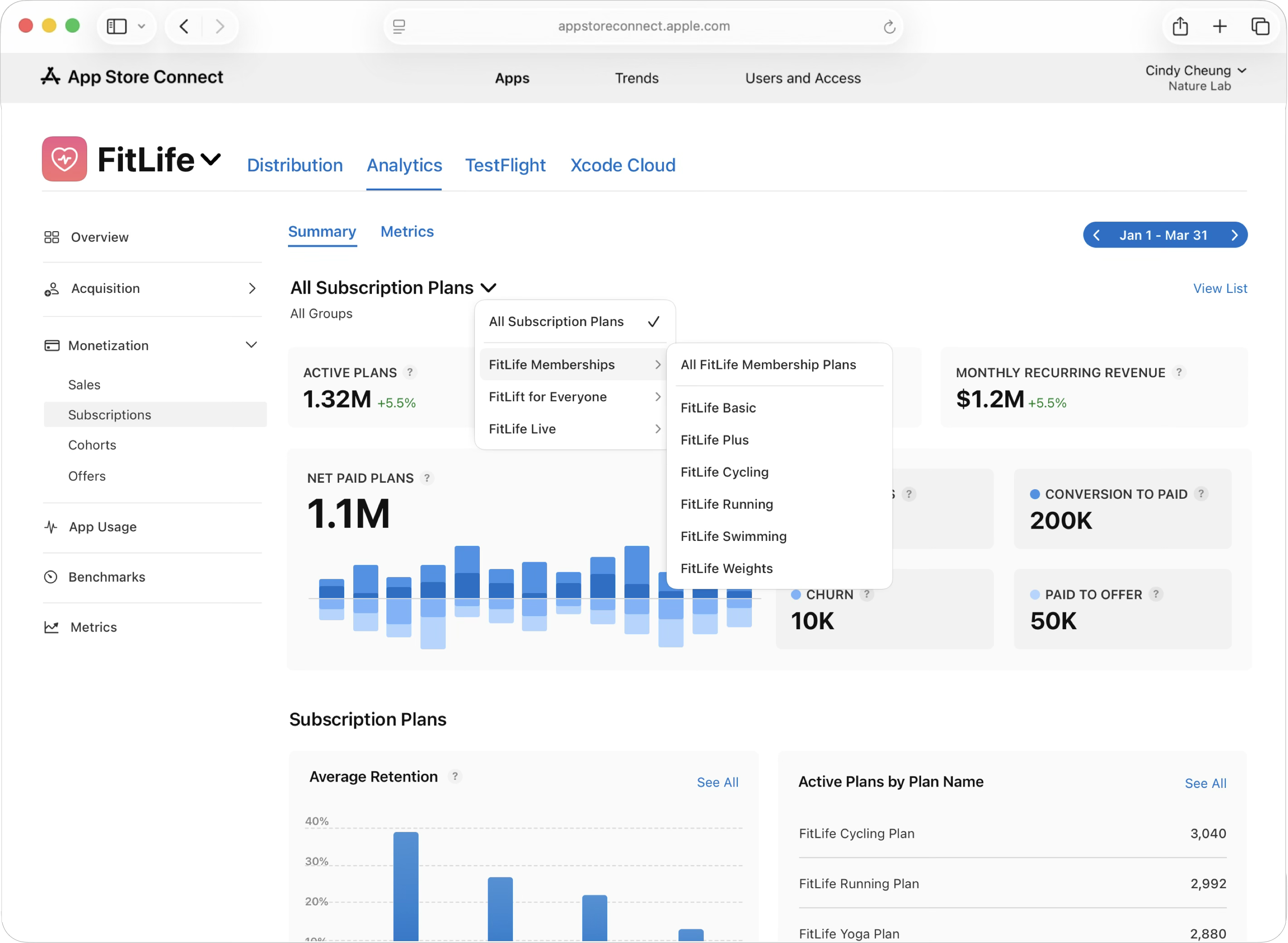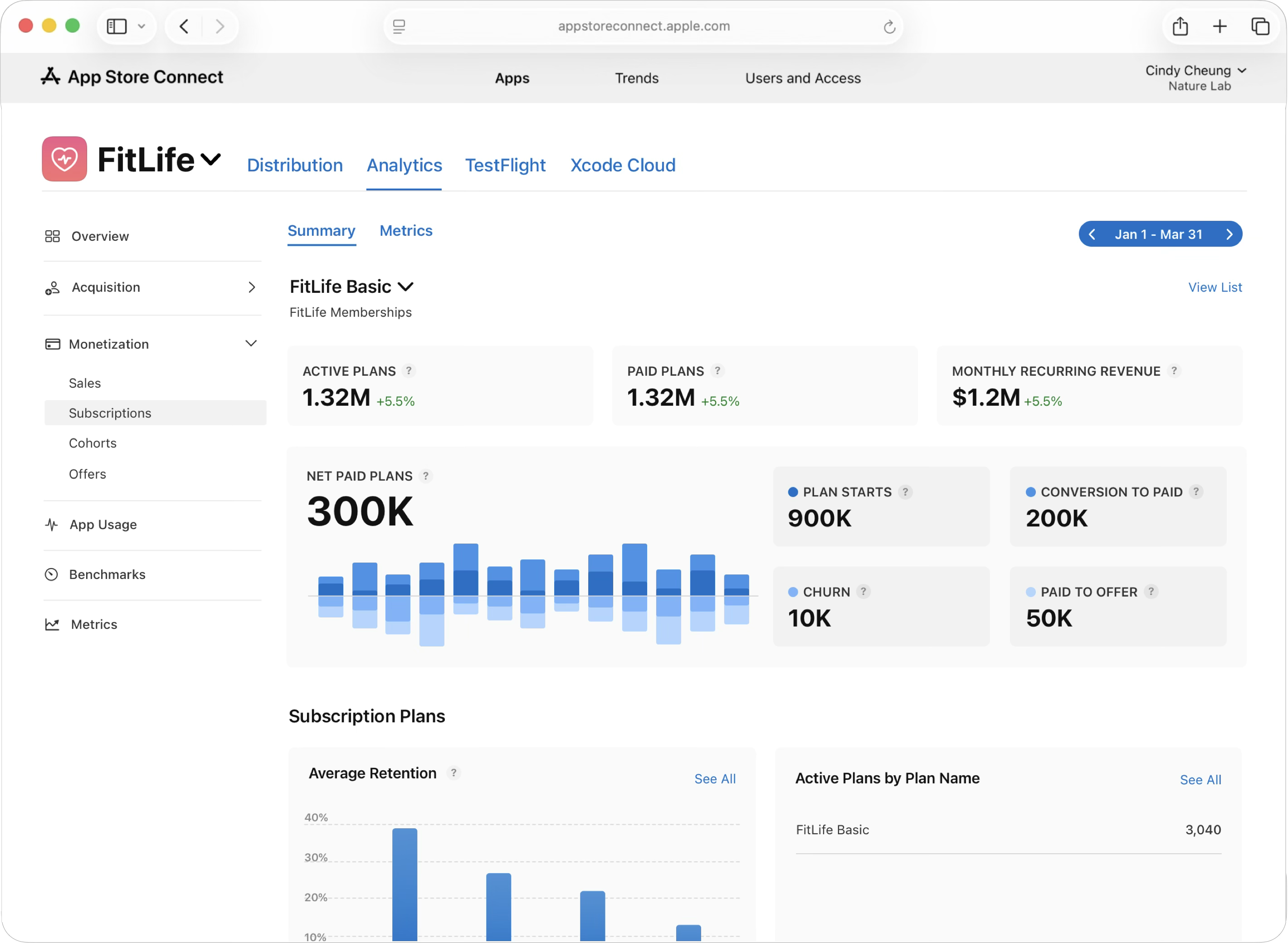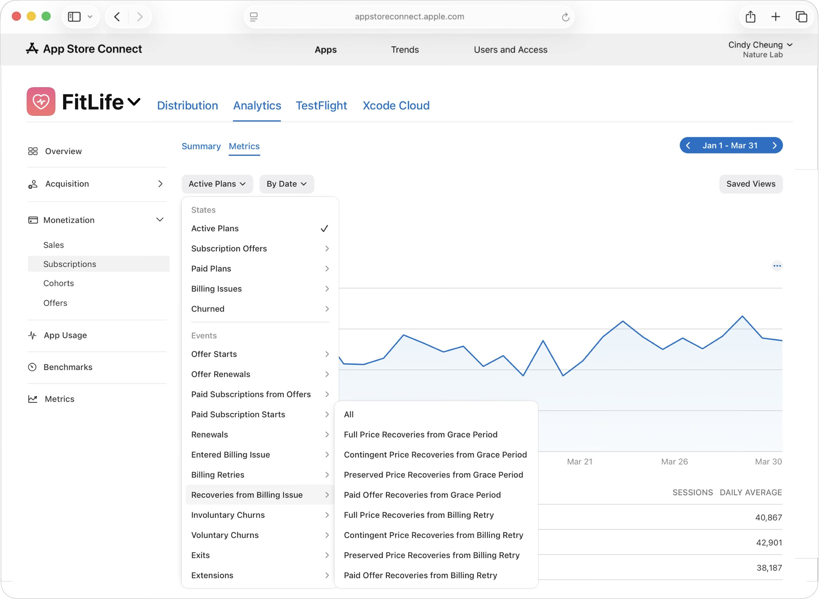 Analytics in App Store Connect helps you understand the full subscription lifecycle, from trial starts to conversions, renewals, recoveries, and churn. You can also measure active plans, free trials, paid offers, conversions, renewals, involuntary churn, voluntary churn, and recoveries across all pricing states (such as full price, preserved price, and contingent price). These metrics help you evaluate acquisition, retention, and monetization in one place.