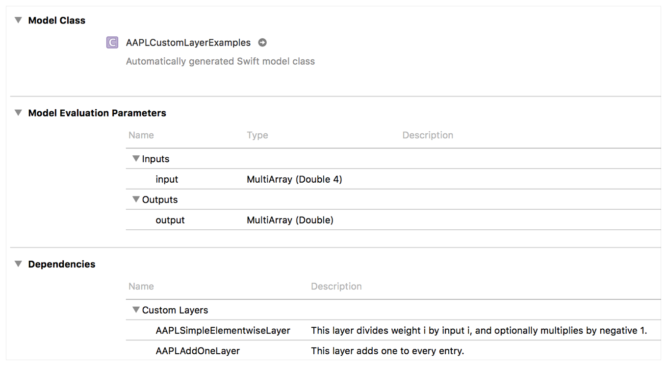 カスタムレイヤを使用する他社製モデルを入手した場合、そのモデルのXcode UIは、カスタムレイヤのないモデルと比べると少し異なる部分があります。ネットワークの入力と出力の下に、依存関係のリストが表示されます。ネットワークの提供元から、そのネットワークをサポートする、レイヤクラスの実装が提供されるはずです。依存関係にリストされているクラスをXcodeプロジェクトに追加し、ネットワークが適切に評価されるようにします。