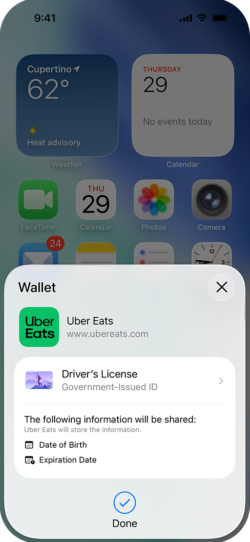 ウォレットの新しい本人確認証明書機能を統合すると、アプリ内で安全にユーザーの本人確認を行うことができます。ユーザーは、本人確認や年齢確認が必要なアプリ内でボタンをタップするだけで、運転免許証や州発行の本人確認証明書の情報をシームレスに提示できます。その際、ユーザーはどのデータがリクエストされており、そのデータが保存されるのかどうか、保存される場合はどの程度の期間保存されるのかを確認することができます。ユーザー情報は、Face IDやTouch IDでユーザーが認証した場合にのみ共有されます。