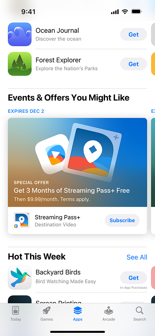 App Store: 추천 앱으로 선정되는 경우 제품 페이지, 에디터의 선택 섹션, 투데이, 게임, 앱 탭의 맞춤화된 추천 항목에 표시됩니다. 사용자는 특가를 탭하여 원활하게 세부 정보를 확인하고, 앱 또는 게임을 열거나 다시 다운로드하여 해당 특가를 사용할 수 있습니다.