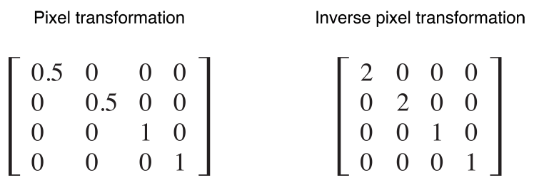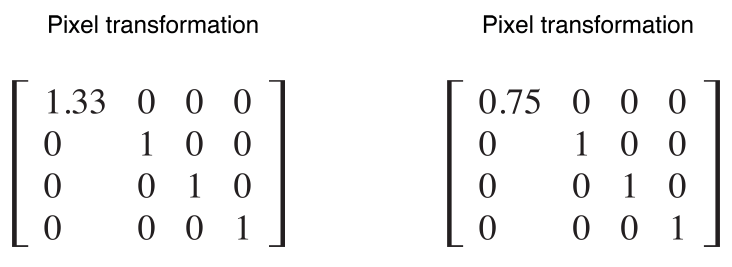 Pixel transforms are 4 x 4 matrices that are created by the host to contain information such as the rotation, scale, and foreshortening of the media the plug-in has been applied to. For example, when a user selects proxy resolution in Motion, or medium quality in Final Cut Pro, this information is contained in the pixel transform. Likewise, when the host asks your plug-in to render a small thumbnail preview, the scaling is contained in the pixel transform. Note that the pixel transform isn’t the full transformation matrix of where the layer is positioned in the scene. For that information, you need to use the Fx3DAPI. A pixel transform instead contains either full or partial information on how the input or output image is distorted before being composited into the scene.