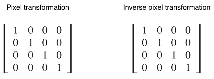 The following are some common examples of pixel transforms you’re likely to see in actual use. If a user creates a project that is a square pixel project and applies some project-sized footage to the canvas—a pretty typical case—the pixel transform will be the identity matrix, as will the inverse pixel transform as shown in Figure 6-3.