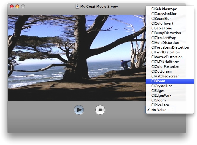 When you launch the application, a document window is automatically displayed showing a preselected movie. You press the Play button and the movie starts playing. You press the Pause button and the movie will stop. A pop-up menu is provided to allow you to select a Core Image filter in to apply to the movie, shown in Figure 1-11. After launch, the filter default is set to No Value.