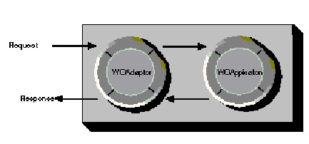 As shown in Figure 2, in each cycle of the loop a WOAdaptor object for the application receives an incoming HTTP request, packages the request in a WORequest object, forwards this object to the WOApplication object in a handleRequest message, and returns the response from the WOApplication to the HTTP server in a form it can understand.