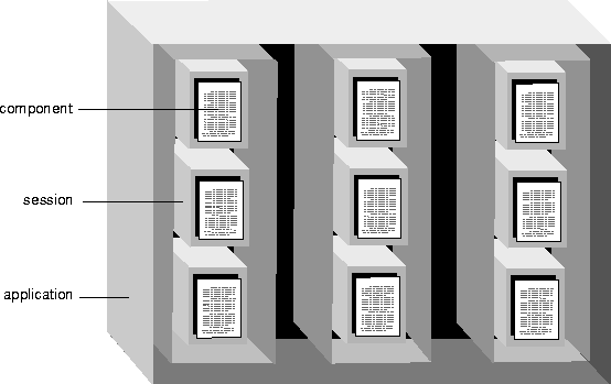 WebObjects defines three classes that manage state in an application---WOApplication, WOSession, and WOComponent. (Note: In Java these classes are known as WebApplication, WebSession, and Component.) An application object handles state associated with the application as a whole, session objects handle state associated with a particular user session within the application, and component objects handle state associated with a particular page or component within a session: