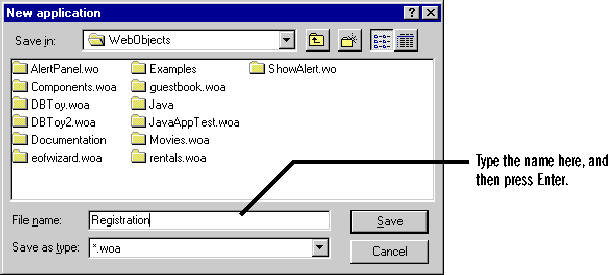 - In the Open panel that appears, navigate to the Registration.woa directory (the application you created in step 2), which is under <DocumentRoot>/WebObjects, and click Open.