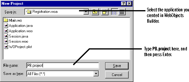 - Type PB.project in the File name field and click Save. (PB.project is a file Project Builder uses to record information about your project.)