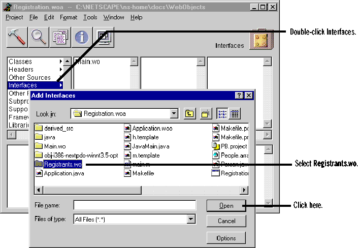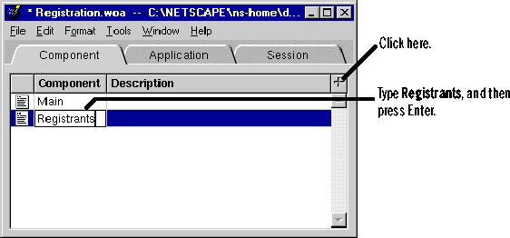 As a final step before compiling, you need to add Registrants.wo to the project in Project Builder. Project Builder must know about Registrants.wo so that the file Registrants.java is compiled during the build. If you had written Registrants.wo in WebScript, it wouldn't be necessary to add the component to the file because WebScript files are not needed during the build cycle.
