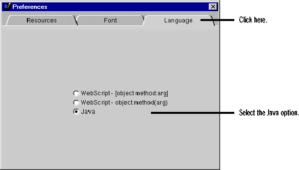 Note: WebObjects Builder's language preference specifies that all new components will be created using that language. If you change the language preference and then add a new component to an existing application, the new component uses a different language than the rest of the application. To prevent this from happening, always set the language preference before you create the application.