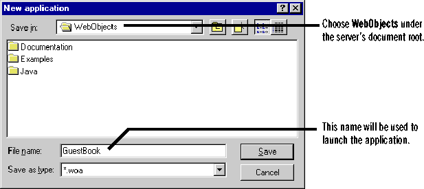 The first step to creating the guest book application is to create a directory for it. A WebObjects application is always contained in a single directory that has the extension .woa. For the application to run, this directory must be under your HTTP server's document root (specifically under the WebObjects subdirectory) so that your server can access it. WebObjects Builder helps you set the application directory up correctly.