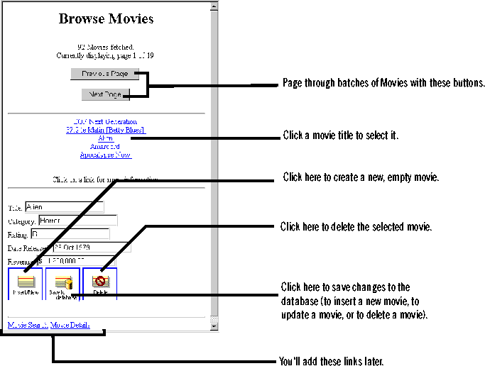 Every WebObjects application has at least one component-usually named "Main"-that represents the first page the application displays. In Movies, the Main component represents the Browse Movies page shown below: