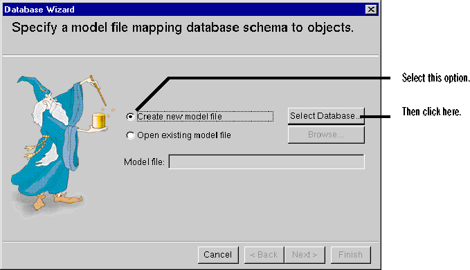 A model file defines a database-to-object mapping that associates database columns with instance variables of objects. It also specifies object relationships based on database join criteria. You typically create model files using the EOModeler application, but the Database Wizard can create a default model as a starting point. Later on, you'll use EOModeler to modify the default model created by the wizard.