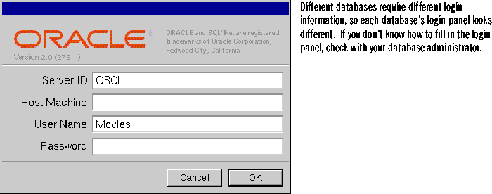 A login panel for the database that corresponds to the selected adaptor opens. The examples in this chapter use the Oracle version of the Movies database included with WebObjects.