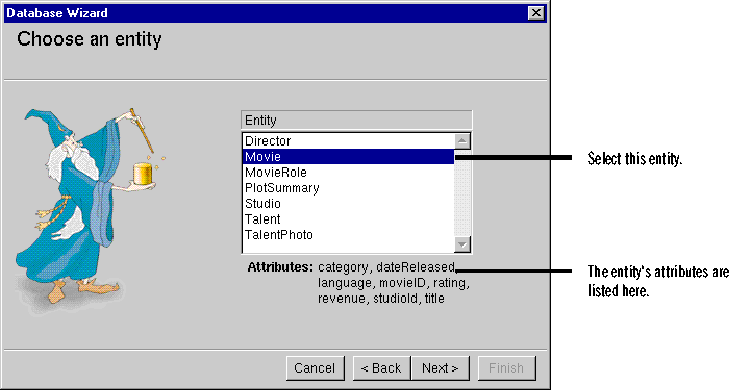 When you choose the Movie entity, the wizard displays its attributes. An attribute is a part of the database-to-object mapping that associates a database column with one of a class's instance variables. For example, the title attribute in the Movie entity maps the TITLE column of the MOVIE table to the title instance variable of Movie objects.