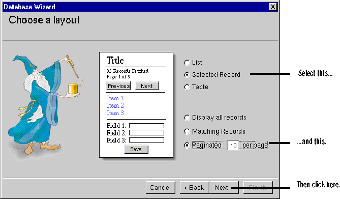 The Database Wizard provides several page layout options for formatting objects fetched from the database.