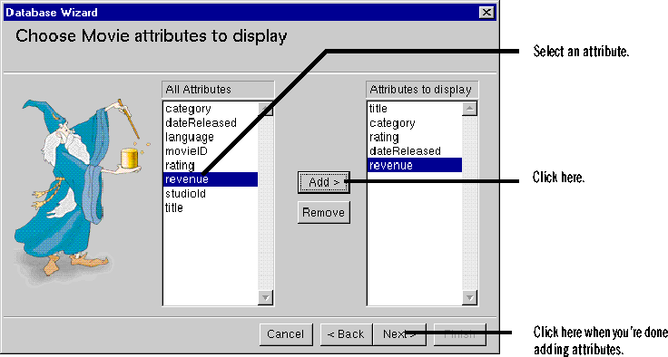 The Database Wizard lists all of the attributes of a Movie object. The next step is to choose which of these attributes the page should display. Most of these attributes will be displayed in the detail part at the bottom of the page.