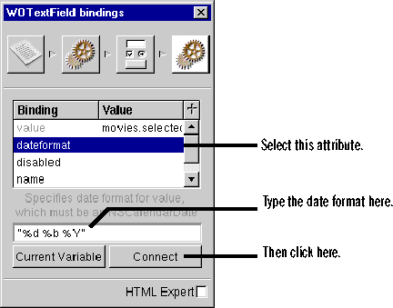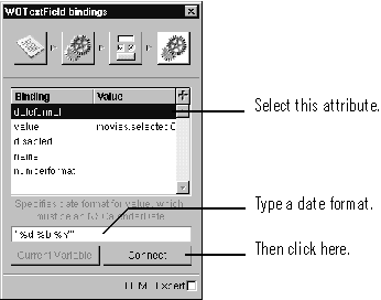 When you run your application, you may notice that the date values are unformatted. Also, if you try to edit a movie or to create a new one, the application returns an error page. At this point, saving changes to the database doesn't work.To enable inserting and updating, you need to add a date format for the dateReleased text field element. The dateReleased attribute is stored as an NSCalendarDate object in Movie objects, but it is represented as an NSString object in the text field. Assigning a date format alerts the Movies application that it needs to translate between NSCalendarDates and NSStrings. For more information, see the NSCalendarDate and NSString class specifications in the Foundation Reference.