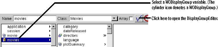The checkmark button is only enabled when a WODisplayGroup object is selected in the object browser.