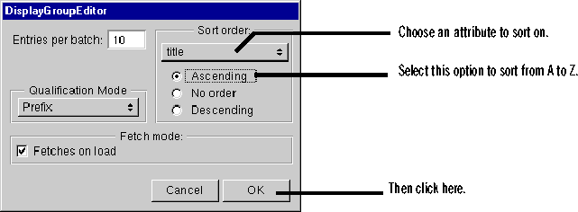 In the DisplayGroupEditor panel that opens, you can configure the movies display group to sort the Movie objects it fetches from the database.