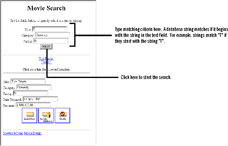 As before, the Database Wizard designs a functional page, but this one allows you to search the database for a movie that matches criteria you specify. It again uses a WODisplayGroup to not only fetch objects from the database, but also to build the query.