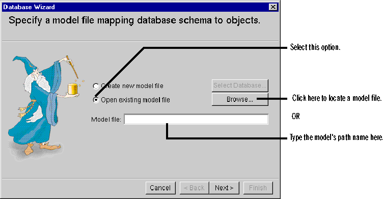 - In the Database Wizard's Specify a model file panel, click Browse to locate the model file.