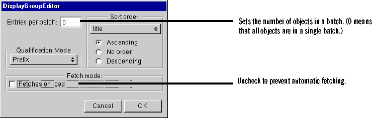 Entries per batch specifies the number of records the display group displays at a time. When this number is 0, as it is in the MovieSearch page, the display group won't display search results in batches. Instead, all the movies that match a user's search criteria are displayed at once. In Main, the batch size is 10 and you use the Next Page and Previous Page buttons to page through the results. The Database Wizard set the batch size to 10 for the Main page because you specified the Paginated 10 per page option when you created it. The Database Wizard sets the batch size to 0 for all other page layout options.