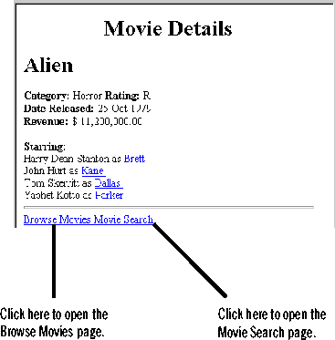 The MovieDetails page shows you the detailed information about a movie you select in either the Main or the MovieSearch page. So, for example, you can choose a movie in the Main page and then click a "Movie Details" hyperlink to display the movie's details in a new page. For this to work, the Main and MovieSearch pages have to tell the MovieDetails page which movie the user selected.