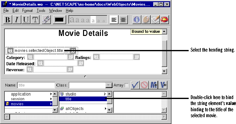 title binds the title of movies' selected object to the heading string's value attribute. The string displays the text "movies.selectedObject.title" to indicate what it is bound to.