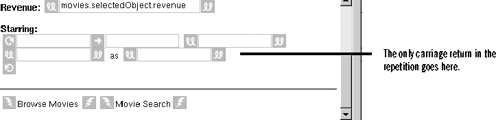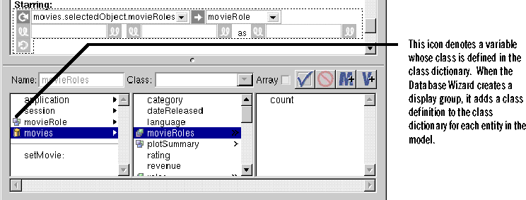 Remember that a Movie object has a movieRoles instance variable that's an array of MovieRole objects. The steps above bind the movieRoles array of the selected Movie object to the repetition's list attribute. WebObjects Builder automatically adds a new variable to the MovieDetails component named movieRole and binds it to the repetition's item attribute.