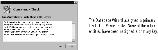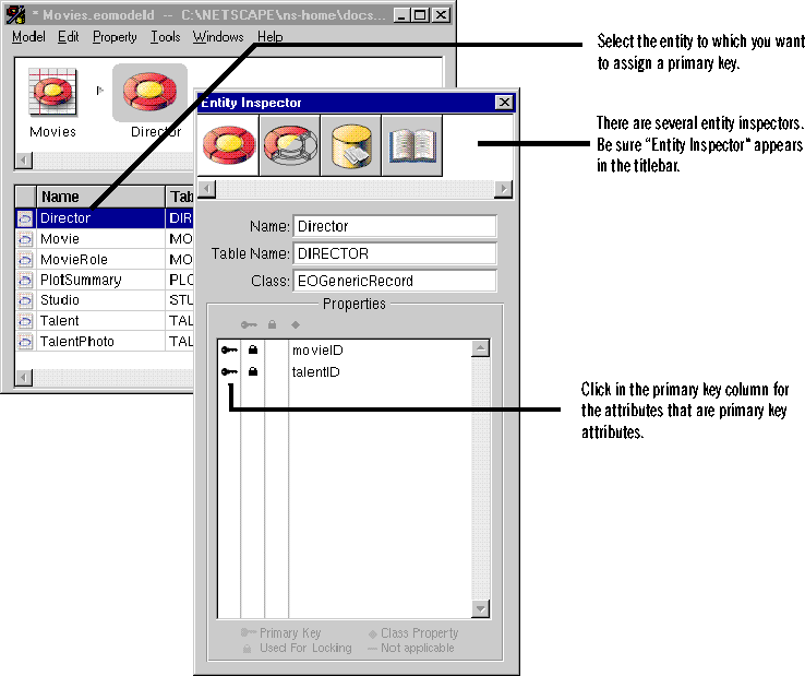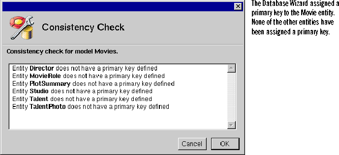 The Database Wizard assigned a primary key attribute to the Movie entity when it created the model. You need to assign primary keys to the rest of the entities using EOModeler.The Movies application only uses the Movie, MovieRole, and Talent entities, but you should assign primary keys to all the entities in case you extend the application later.
