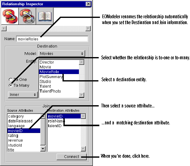 EOModeler automatically renames the relationship based on the name of the destination entity. For example, after connecting a to-many relationship from Movie to MovieRole, EOModeler names the relationship "movieRoles." To-one relationships are named with the singular form of the destination entity's name. For example, EOModeler names the inverse to-one relationship (from MovieRole to Movie) "movie."