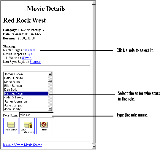 Now you need to make the role name a hyperlink so that users can select it. When the user clicks one of the movie role hyperlinks, the application should select the corresponding MovieRole object in the movieroles display group.