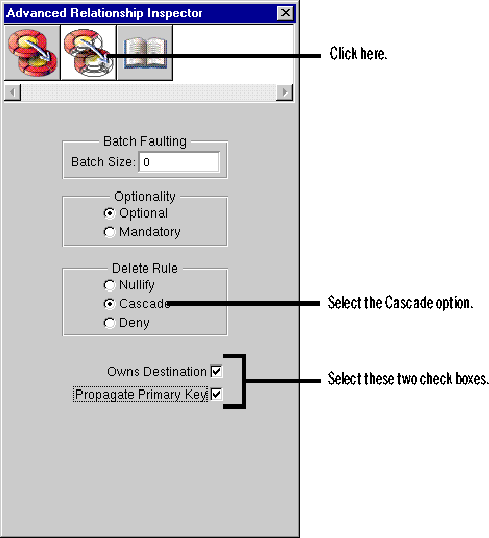 - In the inspector, click the middle icon to display the Advanced Relationship Inspector.