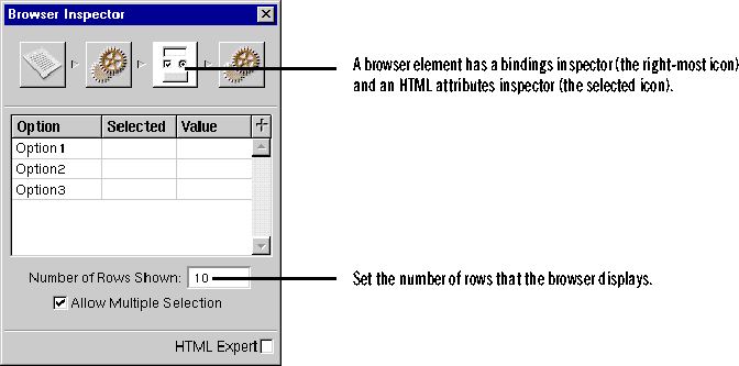 Like a repetition element, a browser has list and item attributes. As the browser moves through its list, it sets item to the object at the current index.