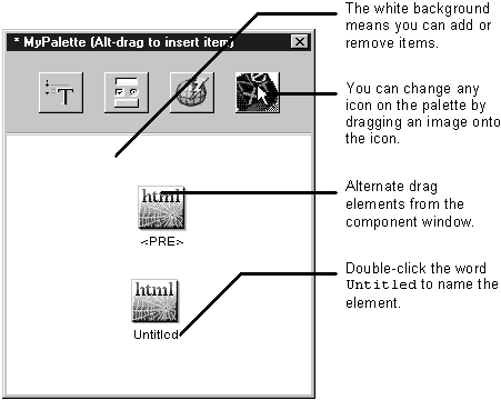 Important: Images and components placed on the palette are copied into the palette. If you add an item to the palette and then wish to change the item: