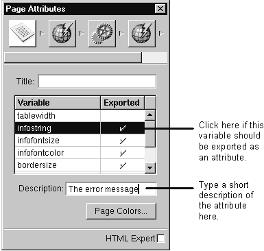 You set up the attributes in the child component's page inspector. The page inspector lists all of the component's variables. Click "Exported" for each variable that should be considered an "attribute," that is, that the parent component might want to bind a variable or method to. When you do this, you'll see the following when you inspect the child component.