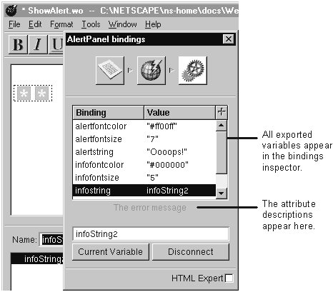 When you use one component (the child component) inside of another component (the parent component), the child component is treated as a dynamic element. Like most dynamic elements, the child component may have attributes that the parent component should bind to variables or methods from the parent's script. To make such a binding possible in WebObjects Builder, you must be able to see the child component's attributes in the bindings inspector when you inspect it from the parent component.