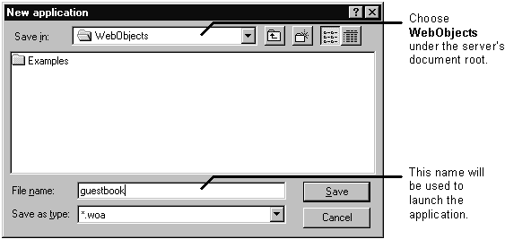 The panel that opens shows you the contents of <DocumentRoot>/WebObjects (unless you have previously saved into a different directory). <DocumentRoot> is your HTTP server's document root, which you specified when you installed WebObjects.