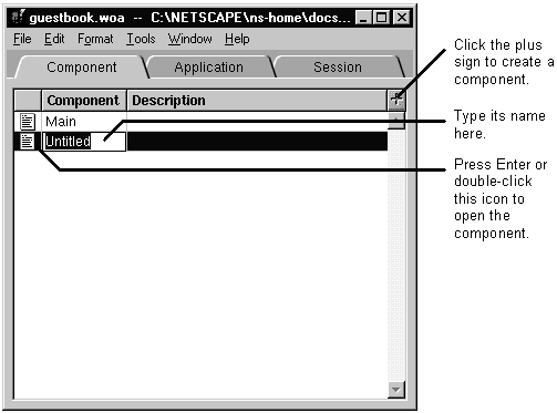 When you create a component, you're creating a subdirectory named Component.wo under the application directory. There are three parts to a component: an HTML template, a script, and bindings between the two. You use WebObjects Builder's component window to create these three parts. "Components" in the introduction to the WebObjects Developer's Guide describes other things that can go into a component.