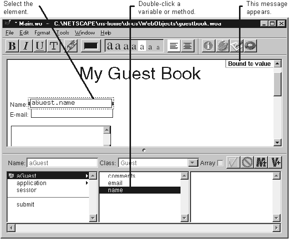 For example, WOString's only default attribute is value, which specifies what the string should display. WebObjects Builder automatically binds to this attribute only if you double-click a simple variable (that is, an Object, Number, or String, all of which can easily translate into a string). If you double-click an array, WebObjects Builder displays the message "No suitable default binding." If you truly intend to bind the WOString to the array, you can do so using the inspector.