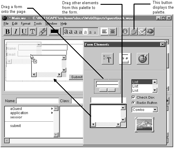 The Form Elements palette can generate either HTML form elements or their corresponding WebObjects dynamic elements (WOTextField, WOSubmitButton, and so on). To generate the WebObjects dynamic element, all you have to do is create a binding for the element. If you don't create a binding, WebObjects Builder generates an HTML form element.