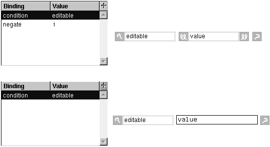 The example below is from a component named ReadWriteString. This component lets you set whether a displayed string is editable using the variable editable. If editable is 1, the component displays the WOTextField contained in the second conditional. The WOString from the first conditional is not displayed because the first conditional negates the value in editable. If editable is 0, the WOString is displayed but not the WOTextField.