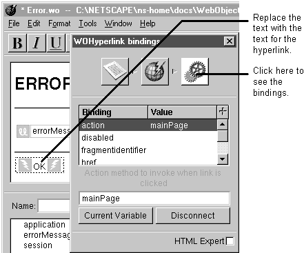 In this case, you can bind to WOHyperlink's pageName attribute. Specify the component's name in the bindings inspector's text field. See "Binding Elements Using the Inspector."