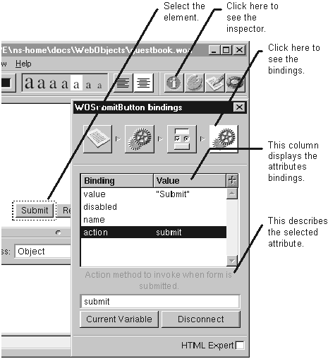Click the element's bindings inspector icon. (Click the inspector button to bring up the inspector window.)