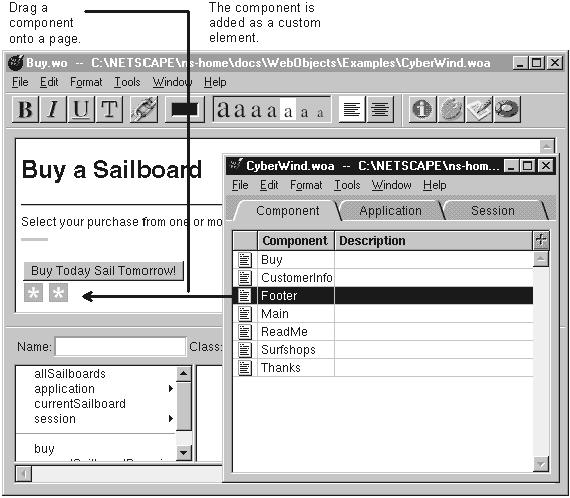 You can drag a component from any application window. If you drag across applications, the component is added to the destination component's application (because WebObjects requires that all components used by an application be in that application's directory.)