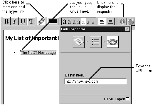 There are two types of hyperlinks that you might use in a WebObjects application. The first is a static hyperlink, whose contents and destination file never change. The second is a dynamic hyperlink (WOHyperlink). To create a dynamic hyperlink see "Creating Dynamic Hyperlinks."