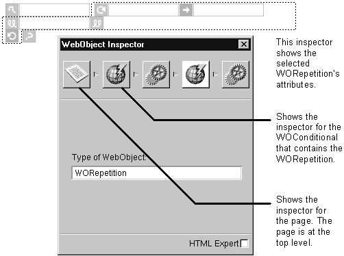inspect the WORepetition, you'll see five icons in the inspector's icon path: the page