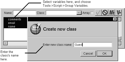 The Group Variables command takes the selected variables and creates a new dictionary class out of them. The variables become the dictionary's attributes. The class's scope is the same as the variables used to create the class. That is, if you group variables in a component window, the class is visible only in that component. If you group variables in an application window, the class is visible in all components.